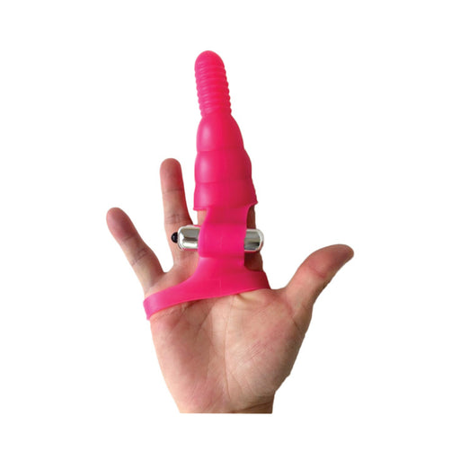 Soft silicone finger sleeve with bullet secures to the palm of your hand for stability. Batteries included.