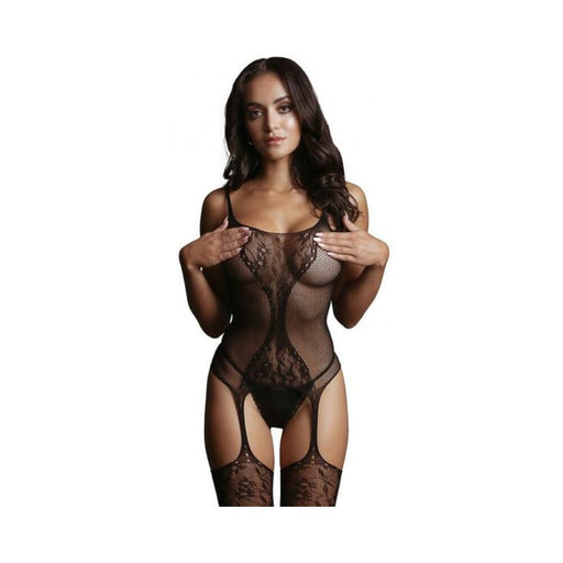 View full detailsSuspender bodystocking with a combination of fishnet and lace-pattern. This bodystocking has a lot of stretch and can be worn from size S to XL. Ha...