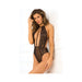 Lace bodysuit-teddy features a high neck, open center panel with adjustable harness straps and back band, a sheer high-waisted panty, high-cut sides, and a thong cut back. Size: Small/Medium.