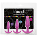 Premium silicone butt plug in three graduated sizes. Measuring at 3 4 and 5 inches this set is shaped and sized to help backdoor beginners gently expand the boundaries of their anal experience. The classic tapered tip slides right in and the firm yet flexible material and curved rocker base make these plugs comfortable and safe for extended wear.