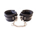 Erotic leather wrist cuffs one D-ring and fully adjustable buckle straps. Padded and fully detachable trigger hook chain.